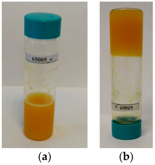 In the initial stage, after mixing the two polymeric solutions, the samples were kept at a constant temperature of 80 °C. Then, the temperature was lowered to 65 °C. The decrease in temperature did not affect fluidity and homogeneity, enabling sampling for analysis. The gelation process was carried in hermetically sealed glass bottles and, for all samples, occurred slowly at room temperature up to 10 days. In order to accelerate the gelation, the process was carried out for all samples by placing freshly prepared gel electrolyte compositions by placing them for 60 min at −22 °C and then stored at room temperature (20–25 °C). Figure 1 presents the full gel electrolyte freshly prepared and after the gelling process.