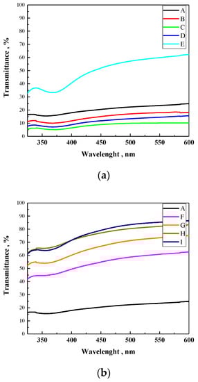 UV-Vis transmittance spectra in film for all investigated electrolytes, where (A) PVDF-HFP; (B) PVDF-HFP:PAB (9:1); (C) PVDF-HFP:PAB (8:2); (D) PVDF-HFP:PAB (7:3); (E) PVDF-HFP:PAB (6:4); (F) PVDF-HFP:PDES-bAP (9:1); (G) PVDF-HFP: PDES-bAP (8:2); (H) PVDF-HFP: PDES-bAP (7:3); (I) PVDF-HFP: PDES-bAP (6:4), (a): A, B, C, D, E and (b): A, F, G, H, I.
