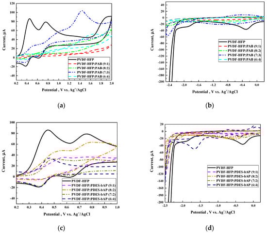 Comparison of voltammograms (oxidation (a,c), reduction (b,d) for PVDF-HFP and compositions of PVDF-HPF:PAB (a,b), PVDF-HPF:PDES-bAP (c,d) with different weight ratios and voltammograms of PVDF-HFP:PAB (9:1) for different cycles (e) and two trials (f)