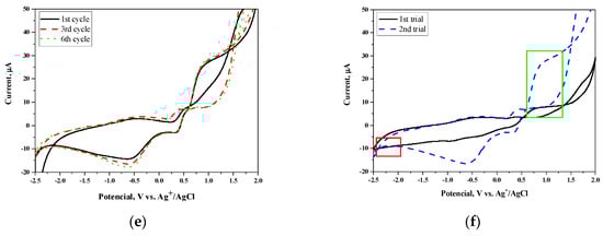 Additionally, a cyclic voltammetry (CV) experiment for each sample included six cycle measurements in order to establish the stability of the system (Figure 3e). Only small changes were observed; however, the main signals used for HOMO and LUMO energy calculations were not affected. Moreover, to exclude the influence of impurities, we performed repetitive measurement that confirmed that the registered data were not affected by any impurities from the measuring system (Figure 3f).