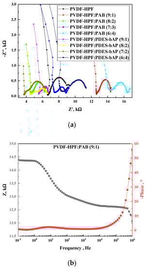 Nyquist plots for all investigated gel electrolytes (a) together with Bode plots for gel electrolyte based on PVDF-HFP:PAB (9:1) (b).