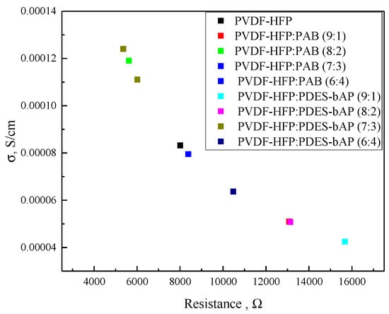 All studied polymer electrolytes exhibit semicircles in Nyquist plots. Moreover, a small drop in values of the real part (Z’) and the imaginary part (Z”) of a polymer composition’s impedance along with a change in the ratio of PVDF-HFP to other polymers can be seen (see Figure 4). Figure 5 represents the relationship between resistance and conductivity, and it can be noticed that the curve demonstrates an almost logarithmic dependence.