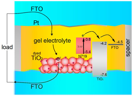 A graphical representation of working principles for a DSSC cell filled with gel electrolyte is presented in Figure 7.
