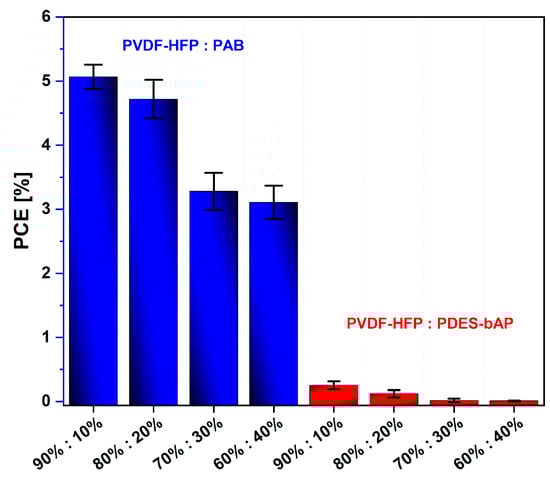 The performance of DSSC devices with all prepared polymer electrolytes were investigated using solar simulator under AM1.5 illumination with 100 mW/cm2 light intensity. The best efficiency was obtained for PVDF-HPF:PAB (9:1). For other constructed DSSC devices, values of PCE were found in the range 0.01–5.07% (Figure 8). The devices based on PVDF-HPF:PDES-bAP exhibited values of PCE below 1%. Photovoltaic parameters of all created DSSC based on PVDF-HPF are collected in Table 5.