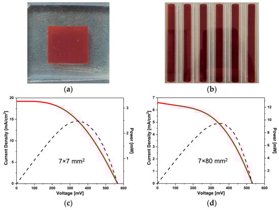 Current-voltage characteristic (red solid) and power curve (black, dashed) of 7 × 7 mm2 (c) and 7 × 80 mm2 (d) gel electrolyte dye-sensitized solar cell along with a photo of a small device (a) and a module (b) we created.