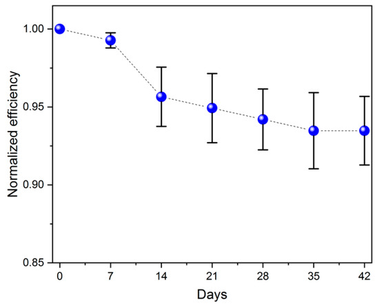 The long-term performance stability of gel electrolyte was investigated by measuring the efficiency over a one-week interval. The temperature during the measurements was stable (22 ± 1 °C), and the samples were stored at normal conditions. As shown in Figure 10, the parameters were obtained individually from six solar cells in the DSSC module and then averaged. The presented data suggest that the power conversion efficiency dropped significantly after approximately 10 days. Then, after two weeks, the performance of the photovoltaic devices began to plateau. Over a period of 42 days, the average efficiency decreased by 7% (to 1.47%) compared to the initial value of 1.57%.