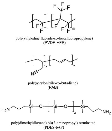 In this work, we investigated eight polymer compositions based on poly(vinylidene fluoride-co-hexafluoropropylene) (PVDF-HFP) and poly(acrylonitrile-co-butadiene) (PAB) or poly(dimethylsiloxane) bis(3-aminopropyl)-terminated (PDES-bAP) copolymers (see Table 1) towards application in DSSCs. The chemical structures of polymers used as components of gel electrolytes are presented in Scheme 1.