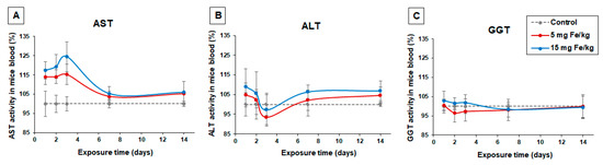 The enzymatic activities of AST, ALT, and GGT are blood markers for liver injuries. The results showed minor changes in these enzyme activities in mice treated with the two doses of nanoparticles (Figure 1) compared to control. The activity of AST started to increase after first-day postadministration of MNP-DSPE-PEG to CD1 mice and reached a maximum in the third day when the AST activity level was higher by 15% (5 mg Fe/kg bw) and, respectively, 24% (15 mg Fe/kg bw) compared to control. In the same conditions, the ALT activity slightly increased on the first day of the experiment by 4% and, respectively, 9% but then started to decrease getting little below the level of control on the third day. The variation of GGT in this period was almost undetected (Figure 1C). After 7 days of recovery, the activity of all three enzymes was registered.