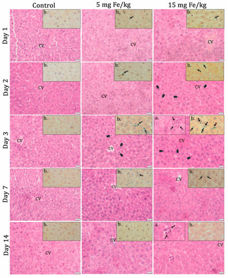 The histopathological aspect of the liver tissues at 1, 2, 3, and 7 d of MNP-DSPE-PEG injection. Hematoxilin&Eosin staining; CV—centrilobular vein; arrowhead—inflammatory cells; (a) detail rectangles—granulomas with giant cells; (b) detail rectangles—Prussian blue staining of the presence of iron deposits (blue color indicated by arrows) in the pathological tissue slides after 1, 2, 3, and 7 d post-MNP injection. Scale bar: 20 μm.