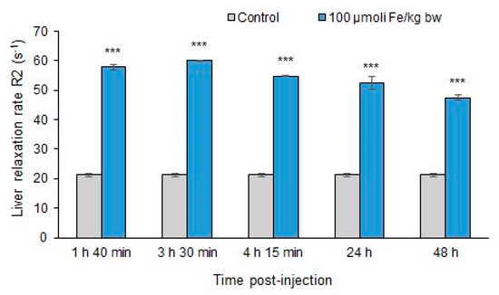 Liver relaxation rate R2 (s−1) following exposure of mice at 100 μmol Fe/kg bw of MNP- DSPE-PEG up to 48 h. Values are represented as mean ± standard deviation (SD) and considered statistically significant when *** p < 0.001 versus the control group.