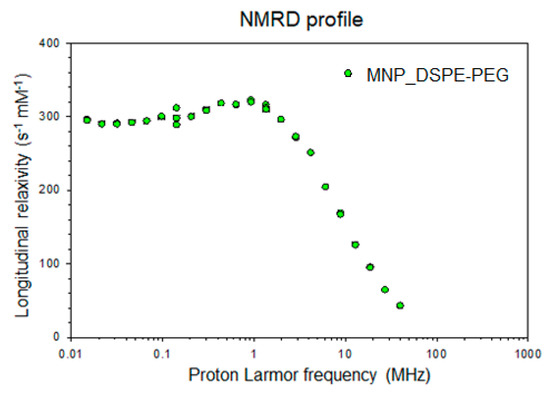 To determine the magnetic character of the MNP-DSPE-PEG, the 1H NMRD profile was acquired on a Fast Field Cycling NMR relaxometer (Stelar, Mede, Italy), which measures the evolution of the longitudinal relaxation time of water protons (T1) as a function of proton Larmor frequency expressed in MHz. NMRD profiles of contrast agents provide at a glance their relaxation efficiency (or relaxivity) at different Larmor frequencies, which is valuable information for MRI applications at a given field.