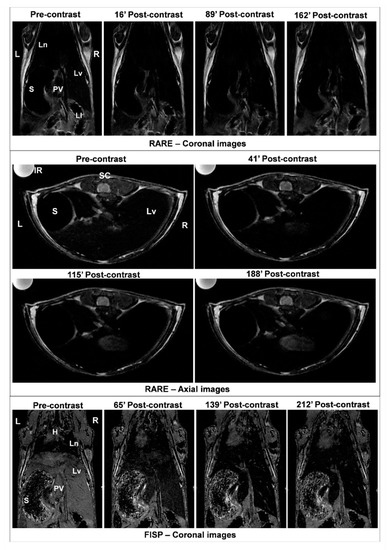 MRI images (coronal and axial RARE, and coronal FISP) of the mouse body acquired with a T2-weighted spin-echo sequence before injection (precontrast) and after injection of MNP-DSPE-PEG (postcontrast) at a dose of 100 μmoles Fe/kg bw, at different time intervals. Abbreviations: L: left, R: right, Ln: lungs, S: stomach, PV: portal vein, Lv: liver, LI: large intestine, SC: spinal cord, H: heart.