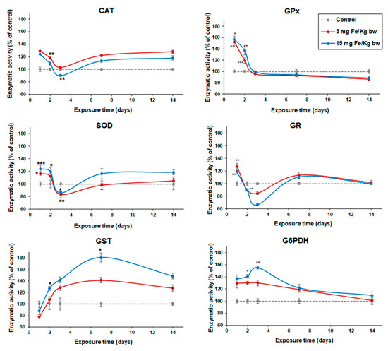 Variation of enzymatic activity of CAT, SOD, GPx, GR, GST, and G6PDH in the liver of CD1 mice treated with 5 and 15 mg Fe/kg bw of MNP-DSPE-PEG after 1, 2, 3, 7, and 14 d from the administration. Values are represented as mean ± standard deviation (SD) and are expressed as a percentage of control; the results were considered statistically significant when * p < 0.05; ** p < 0.01; *** p < 0.001 versus the control group.