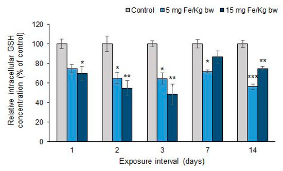 Effect of exposure of CD1 mice at doses of 5 and 15 mg Fe/kg bw of MNP-DSPE-PEG on the level of GSH in the liver, after 1, 2, 3, 7, and 14 d. Values are calculated as mean ± standard deviation (SD) and expressed as percentages related to the control group; the results were considered statistically significant when * p < 0.05; ** p < 0.01; *** p < 0.001 versus the control group.