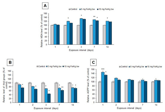 Protein thiol groups (P-SH, Figure 8B) and advanced oxidation protein products (AOPP, Figure 8C) were analyzed as markers for protein oxidations. The injection of MNP-DSPE-PEG caused a dose-dependent decrease in the P-SH level in the mice liver. The maximum decrease was observed after three days by 29% in mice injected with 5 mg Fe/kg bw and by 56% in those injected with 15 mg Fe/kg bw, compared with the control group. On the other hand, the AOPP level increased after the first day of exposure by 46% for the low dose and, respectively, by 32% for the high dose, compared to the control. After this interval, the level of AOPP changed and no significant increase was registered up to 14 d.