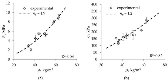 In order to estimate the mechanical reinforcement efficiency of foams by Equations (5) and (9), exponents nE, nσ and shape anisotropy functions , entering the respective expressions need to be specified. For stiffness and strength in the direction transverse to the foam rise, the latter can be expressed in the form and respectively by the rectangular-cell model; see [28,34]. As concerns the exponents of the density dependence of foam characteristics, we evaluated them by fitting Equations (2) and (7) to the experimental data for neat foams of the same formulation reported in [34]. The respective data are shown in Figure 2 together with best-fit approximations corresponding to nE = 1.9 and nσ = 1.2. Notably, the value of the power-law exponent for the density dependence of foam stiffness is very close to the one derived for low-density open-cell foams and amounting to nE = 2, while the exponent for strength is lower than the predicted nσ = 1.5 [28].