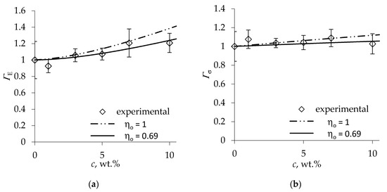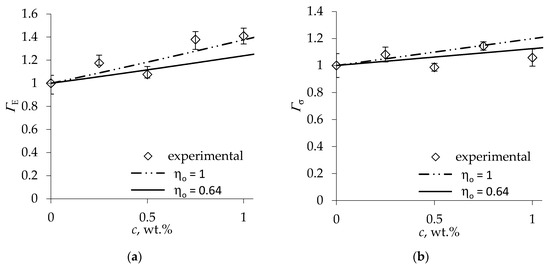For theoretical estimation of the mechanical reinforcement efficiency factor of foam stiffness according to Equation (4), we rely on the MCC fiber properties reported in the literature. The axial modulus . of deagglomerated, rod-like MCC fibers was evaluated at 25 GPa [40], and shear modulus . of MCC at vanishing porosity was estimated as 3.5 GPa [41]. Due to good adhesion expected between the cellulose and PU polymer, the fiber/matrix interface stiffness parameter . implying perfect interface [35] is used in Equation (12). The stiffness and density of the neat polymer amounted to Es = 2.3 GPa and ρs = 1210 kg/m3 [34]. The fiber volume fraction in the solid polymer is expressed via fiber weight fraction c (of neat polymer weight) as with denoting the density of MCC fibers. Since the foam expansion ratios, calculated using the foam density values of Table 2, exhibited little variation ranging between 33.5 and 36.4, the average expansion ratio was applied to evaluate the fiber orientation factor by Equations (18) and (19), yielding ηo = 0.69. The resulting dependence of ΓE on MCC fiber loading according to Equation (4) is plotted in Figure 3a by a solid line. A good agreement of the theoretical prediction with the efficiency factor values derived from test results is seen.