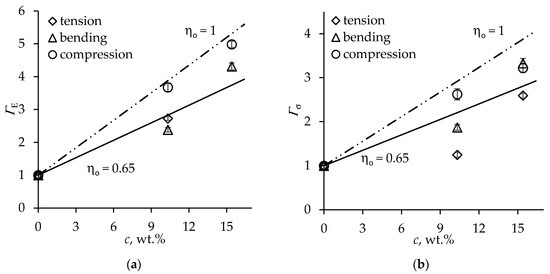 For theoretical estimation of the reinforcement efficiency factors of CNF-filled foams, we employed the longitudinal modulus = 88 GPa determined for hardwood-derived CNF [49] and strength = 1.6 GPa [50]. Due to the large aspect ratio of CNFs [10], the fiber length efficiency factor was taken as . The volume fraction of CNF in the PU polymer was expressed via the weight fraction as . The properties of monolithic PU were assumed to be the same as above. The theoretical mechanical reinforcement efficiency of foams as a function of CNF loading according to Equations (4) and (8) is plotted in Figure 5 by solid lines for the partial alignment of fibers in the cell struts (ηo = 0.65). It is seen that the predicted dependence of reinforcement efficiency on filler loading reasonably closely reflects the experimental trend, although the relative RMS error values are considerably larger, see Table 3, which is mainly due to the scatter among results for different loading modes. The predicted reinforcement efficiency for ηo = 1, shown by broken lines in Figure 5, demonstrates the ΓE, Γσ values theoretically attainable at a perfect CNF alignment.