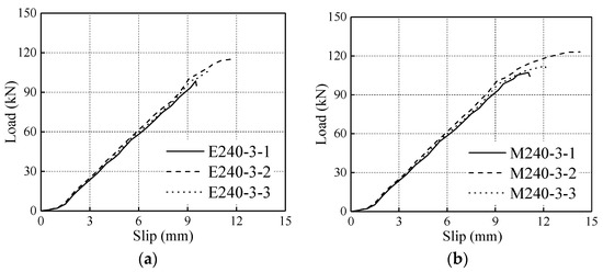 Load-slip curves at room temperature. (a) Specimens with commercial epoxy resin; (b) specimens with modified epoxy resin.