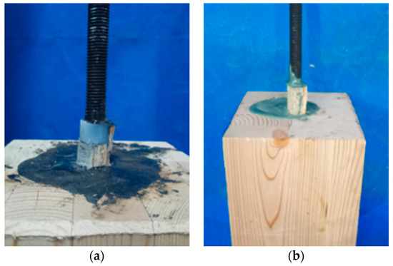 As shown in Figure 1, holes for the tested end and supporting end have a 22 mm and 28 mm diameter, respectively. The holes were manually drilled parallel to the grain, at both ends of the timber blocks. Each threaded rod was cleaned with acetone to remove dirt and grease from its surface before gluing. Structural adhesive was injected into the pre-drilled holes from the bottom, using a dosage of approximately 1/2 the volume of the hole. The cleaned threaded rods were then slowly inserted into the partially-filled holes and were rotated until they reached the bottom of the holes, to thereby expel any trapped air bubbles that might affect the bonding strength. To ensure the threaded rod implantation remained centered, a plastic casing with a 22 mm outside diameter, 3 mm wall thickness, and 10 mm length was employed on the top of the rod after insertion for the tested end. Similarly, the plastic casing with a 28 mm outside diameter were applied on rod at the supporting end. All specimens were kept in a room at 20 °C and at a relative humidity of 65% for at least 30 days before testing.