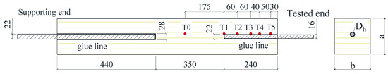 In particular, holes of 3 mm in diameter were pre-drilled in designed positions of thermocouples for each specimen, and then the thermocouples were reliably banded into the target depth of the holes. From Figure 4, the 3 mm holes for thermocouples can be observed at the side face of glue-in rod joint specimens. The holes were sealed tightly with refractory clay after all thermocouples were fixed.