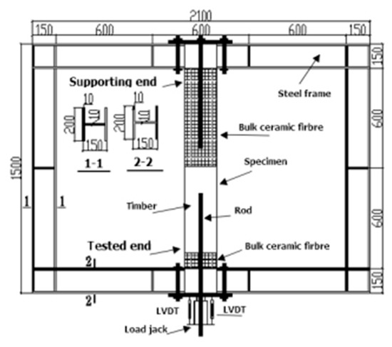Figure 1 shows the configuration of a pull-pull specimen of the glued-in rod timber joint that was used for fire testing. The specimens were designed with double ends for testing. The tested end adopted an anchorage length of 15 d (d = the diameter) and a 3 mm thickness for the glue line. The diameter of the threaded rod at the tested end was 16 mm, whereas that at the supporting end was 22 mm. As shown in Figure 1, Dh was equal to 22 mm and represented the hole diameter at the centre of the timber block for the tested end. For all specimens, the supporting ends were designed with a greater capacity when compared with the tested end. For the supporting end, the anchorage length was equal to 20 d, and it was also protected by bulk ceramic fibre in the fire furnace, to ensure the anchorage reliability of the supporting end before the shear-bond failure of the tested end in the fire testing process.