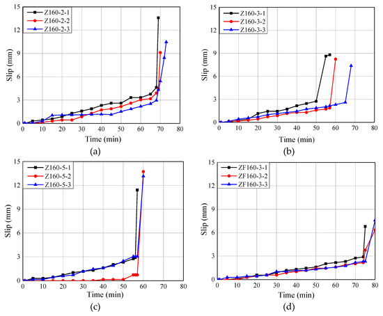 Slip-time curves. (a) Stress level = 20%. (b) Stress level = 30%. (c) Stress level = 50%. (d) Stress level = 30% with fireproof coating.