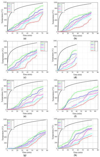 Temperature-time curves. (a) Z160-2; (b) Z160-3; (c) Z160-5; (d) S160-3; (e) Z200-3; (f) Z240-3; (g) ZF160-3; (h) ZTF160-3.