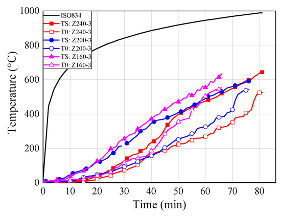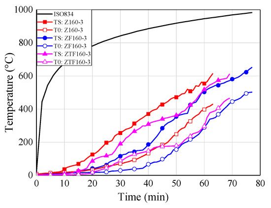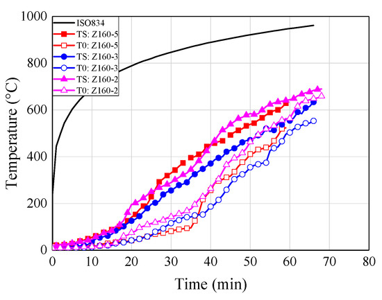 Figure 11 shows the effects of the stress level on the failure time of the glued-in rod joints in the fire tests. The temperature value of measuring point T0 refers to the average value of the three duplications. The values of TS were calculated by the 15 measuring points, i.e., T1~T5 for all of the three duplications. Same calculation method was also applying to Figure 12, Figure 13 and Figure 14. When the stress levels were 20%, 30%, and 50%, the corresponding average values for failure time were 70 min, 64 min, and 57 min, respectively. With the increase of the loading level, the fire resistance of glued-in rod joints declined obviously, denoting the decline of the heat resistant of the modified epoxy adhesive. Therefore, the stress level cannot be ignored in the fire protection design.