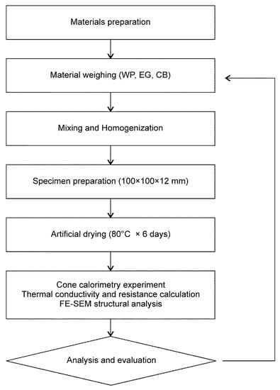 A flowchart representing the experiments performed in this study is provided in Chart 1. The experiment was carried out in the following order: Selection of materials for fabricating the expandable graphite composites; weighing, mixing and homogenization; specimen preparation; artificial drying; cone calorimetry experiment; and finally, data analysis and evaluation.