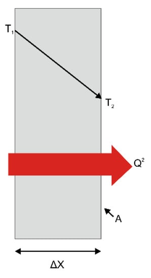 In the above equation, the proportionality constant, k, represents the thermal conductivity of the material, i.e., the capacity of the material to conduct heat. In the extreme case of Δx → 0, the above equation takes a differential form. In this case, Equation (2) is Fourier’s law of heat conduction, and dT/dx is the temperature gradient, i.e., the gradient of the temperature curve at position x in the T-x diagram (rate of change of T with x). This implies that the heat transfer rate is proportional to the temperature gradient in the heat transfer direction. When x increases, the temperature T2 decreases, and the temperature gradient becomes negative because heat is transferred to a lower temperature region. Therefore, a minus sign is added to Equation (2) so that the heat transfer value will turn positive for a heat flow in the positive x direction [,]. In other words, thermal conductivity can be defined as the amount of heat that flows through a material per unit time through a unit area with a temperature gradient of one degree per in unit distance. A material with a high thermal conductivity is an excellent thermal conductor, and a material with a low thermal conductivity is an insulator (heat insulator).