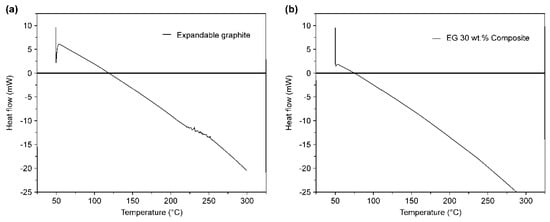 Figure 2 shows the differential scanning calorimetry (DSC) analysis of the expandable graphite (a) and EG 30 wt.% composite specimen (b). The DSC analysis was conducted at a heating rate of 10 °C/min in an Ar Inert gas atmosphere. In Figure 2a, the expandable gas absorbed heat at approximately 54 °C, and the heat flow reached −20 mW at 300 °C. At this period, the heat absorption rate was 1.04 mW/min. In Figure 2b, the EG 30 wt.% composite absorbed heat at approximately 54 °C, and the heat flow reached −25 mW at 285 °C. At this period, the heat absorption rate was 1.174 mW/min. It was considered that the EG 30 wt.% composite had a faster heat absorption rate than that of the pure expandable graphite because it absorbed a large amount of heat to carbonize the wood particles in the specimen.