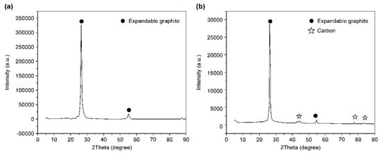 XRD analysis of the expandable graphite (a) before and (b) after combustion.