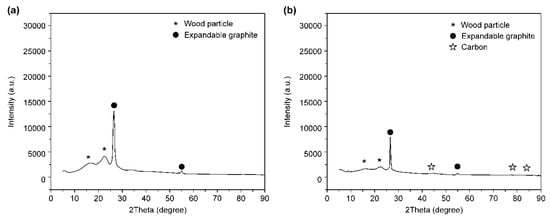 Figure 3 shows the X-ray diffraction (XRD) analysis before (a) and after (b) combustion of pure expandable graphite. In Figure 3a, the main peaks are at 27° and 55°, which were reflected by graphite. In Figure 3b, the peaks at 45°, 78°, and 83° confirmed that the expandable graphite was decomposed by heat to form carbon. Figure 4 shows the XRD analysis before (a) and after (b) combustion for the EG 30 wt.% composite. In Figure 4a, the diffraction peaks can be observed at 16° and 23° due to the effect of wood particles in the composite. Furthermore, Figure 4b shows that the diffraction peak of the wood particles lowered after the combustion of the sample, and that carbon was detected as a result of the combustion of the wood particles and thermal decomposition of expandable graphite.