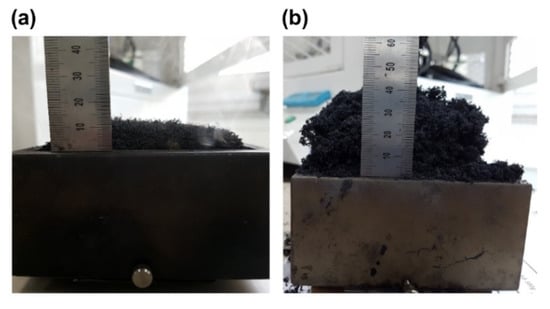 In the cone calorimetry experiment, the distance between the specimen and the cone heater of the cone calorimeter (FESTEC, Seoul, Korea) employed for the combustion experiment was fixed at 60 mm considering the expandability of expandable graphite. Moreover, the applied calorific value was set at 50 kW/m2. The experiment was performed for 5 min for each specimen at a laboratory temperature of 28 ± 1 °C and relative humidity (RH) of 60% ± 5%.