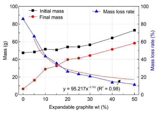 Figure 7 details the mass loss rate of the specimen after the experiment according to the expandable graphite content. The mass loss rate was determined from the difference between the specimen masses before and after the experiment. The mass loss rates were 86.2%, 67.5%, 43.5%, 35.4%, 26.7%, 23.6%, 21.1%, 15.1%, and 12.4% (with a standard deviation of 25.1) for wood particle contents of 0, 5, 10, 15, 20, 25, 30, 40, and 50 wt.%, respectively, with expandable graphite of 0–50 wt.% by 5 wt.%, respectively. The mass loss rate gradually decreased as the expandable graphite content increased. The thickness of the expanded graphite layer (Leg) increased as the content of expandable graphite increased. The heat transfer became more disturbed as the expanded graphite layer thickness increased because the space formed between the expanded graphite interferes with heat transfer.