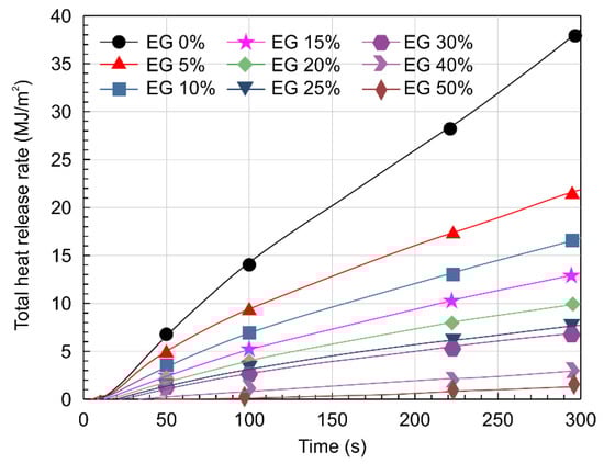 Figure 10 presents the total heat released (THR) with the combustion time of the specimens. We observed that the THR decreased from 38.63 MJ/m2 to 21.94, 16.78, 13.14, 10.11, 7.76, 6.86, 3.80, and 2.50 MJ/m2 (standard deviation: 11.28) as the expandable graphite content increased from 0 to 50 wt.%. In addition, the ignition time varied from 13 to 66 s and was reduced with increasing expandable graphite content.
