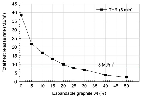 The THR as a function of the expandable graphite content is plotted in Figure 11 and compared to the performance standard of the flame retardance. A THR value of 6.86 MJ/m2 was obtained at an expandable graphite content of 30 wt.%. In addition, the corresponding THR was shown to fall below the threshold value of 8.0 MJ/m2, which was required to meet the performance standard for a flame retarding material in Table 3 below.