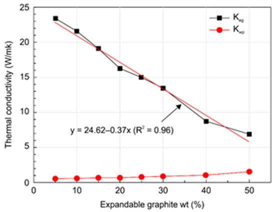 Figure 14 shows the variation of thermal conductivity in the expandable graphite content. As shown, the thermal conductivity of the expanded layer (keg) decreased from 24.62 W/m·K at an expandable graphite content of 0 wt.%, to 7.83 W/m·K at expandable graphite content of 50 wt.% (standard deviation: 6.19). However, the thermal conductivity of the unburned wood particles specimen layer (kwp) increased from 0.40 W/m·K at 0 wt.% of expandable graphite content to 1.07 W/m·K at 50 wt.% of expandable graphite content (standard deviation: 0.23).