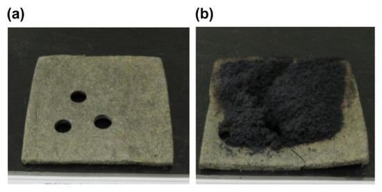 Figure 16a is the image of a specimen with three perforated holes 25 mm in diameter, and Figure 16b shows its post-combustion state after the test.