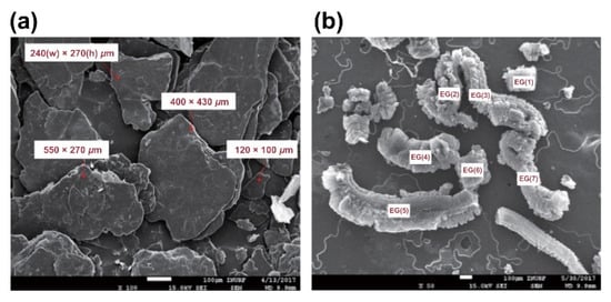 The microstructure of expandable graphite before combustion and that of expanded graphite after combustion were analyzed using field emission scanning electron microscopy (FE-SEM). Figure 17a depicts the microstructure of the expandable graphite prior to its heating. The size of the expandable graphite before combustion was 120–550 μm in width, 100–430 μm in length, and approximately 10 μm in thickness, as determined from three microscopy measurements. The morphology was revealed to adopt a laminated layer structure, characterized as a plate type with flat surfaces. Figure 17b displays the morphology of the expanded graphite after combustion. Upon heating, expanded graphite experiences expansion in the interlayer spacing and thereby adopts a worm shape. The size of the expanded graphite was measured as 180–270 μm in width and 250–1470 μm in length. The thickness of the expanded graphite upon heating was shown to increase approximately 20 times compared to the initial thickness of 10 μm prior to its combustion.