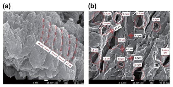 Figure 19a depicts the morphology of expanded graphite after heating. The magnified image of the microstructure revealed that the fine lattice layer repeated with 16–22 μm spacing. Figure 19b shows the image of the expanded graphite at a 4000× magnification. The thickness of the lattice layer was 0.1–0.4 μm with internal gaps of 1.0–2.5 μm. Upon exposure to heat, the expandable graphite expands. As the expandable graphite content increases, the thickness of the expanded graphite increases, and the distribution of the fine lattice layer also increases in proportion. Therefore, it can be deduced that the transfer of heat and gas contained in the region within the expanded graphite is inhibited due to the fine lattice layer structure. As a result of this phenomenon, the increase in expandable graphite content was observed to have a direct impact on the decrease in thermal conductivity of the composite.