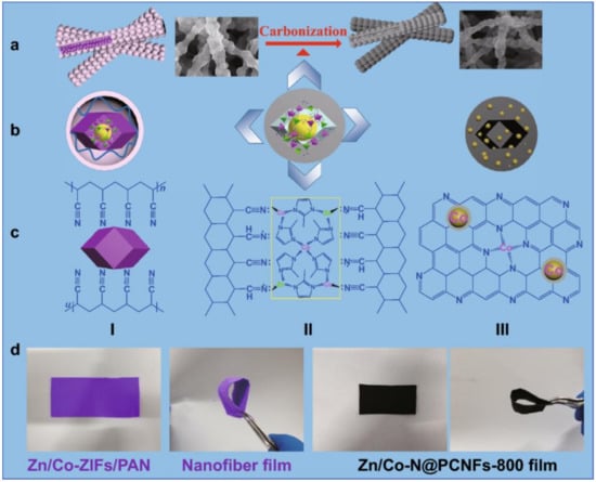 | Carbon-based | pyrolyzed - Zn/Co-ZIFs/polymer nanofibers | c | / | MOF fibers | ORR OER electrocatalyst | PEMFC, Zn–air batteries | [95] |
