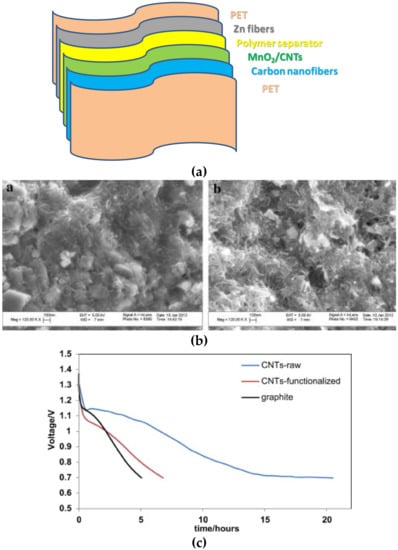 | CNTs Polymer Nanostructured metal | MnO2/SWCNTs cathode Zn foil anode | polyethylene oxide/TiO2 nanoparticles | carbon nanofiber mats current collector | flat | flexible | Zn–carbon | [145,146] |