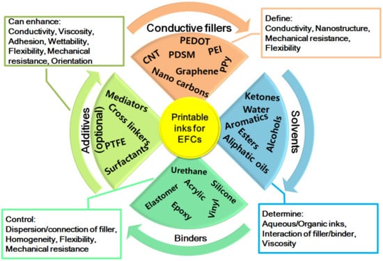 | conductive polymer | polystyrene sulfonate/polyethyleneimine/polypyrrole | c | c | ink filler | flexible, electron conductive | EFCs | [216,217,218] |