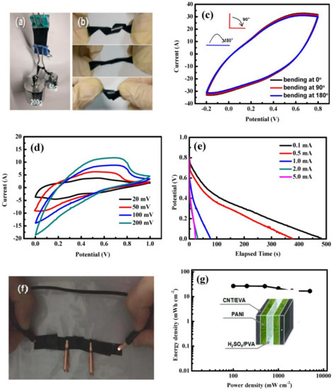 - Guan, X.; Kong, D.; Huang, Q.; Cao, L.; Zhang, P.; Lin, H.; Lin, Z.; Yuan, H. In situ growth of a high-performance all-solid-state electrode for flexible supercapacitors based on a PANI/CNT/EVA composite. Polymers 2019, 11, 178. [Google Scholar] [CrossRef] [PubMed]