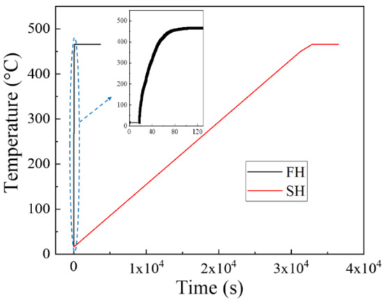 Specimens cut from the cold-rolled sheet were solution treated at 475 °C for 1 h in a circulating air furnace. Two heating rates were used during the heat-up: Fast heating (FH) was performed by putting samples in the furnace, pre-heated to the solution temperature (475 °C). To make the slow heating (SH) samples, samples were placed in the furnace at room temperature and heated at 50 °C/h to 475 °C. The heating rates for both the FH and SH samples were measured using a thermocouple. The heating curves are shown in Figure 1 and the inset figure is the rapid heating curve in the very early stage. The measured heating rate for the FH sample is approximately 325 °C/min and the heating rate for the SH sample is as expected (50 °C/h).