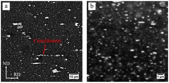 The EC of the cold-rolled sample was measured as 45.4% International Annealed Copper Standard (IACS), compared with the ~32.5% IACS for the solution-treated 7075 alloy, indicating that a high fraction of the solute is present in the form of second phase particles. These particles were observed using SEM, as shown in Figure 3. The low magnification SEM image in Figure 3a clearly shows that the constituents, normally identified as Al7Cu2Fe in 7075 alloy, were fragmented and aligned with the direction of cold rolling. The high magnification SEM image, as shown in Figure 3b, shows that a large number of smaller particles, known as dispersoids and equilibrium precipitates (η phases) in 7075 alloy, were observed.