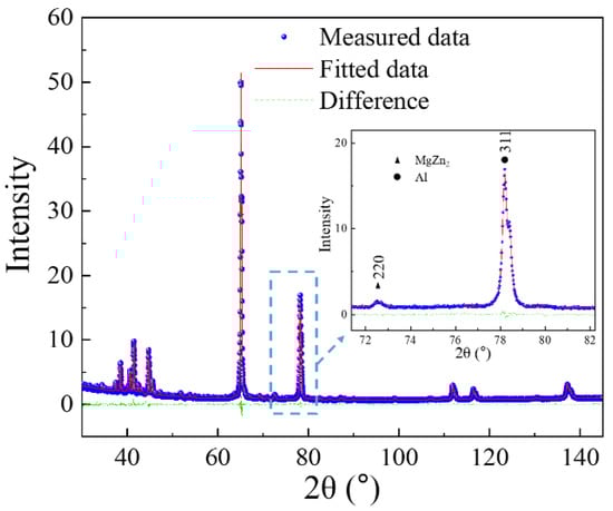 The high density of dislocations after cold rolling is observed in the TEM bright field (BF) image, shown in Figure 4. The dislocation density is difficult to determine from the TEM-BF image as the dislocations tangle up with each other and small particles. However, the fitting of X-ray line profile data can be used for obtaining the dislocation density [28]. The diffraction patterns, including the measured patterns, the fitted patterns and the differences, are shown in Figure 5. The zoomed figure in Figure 5 shows that the peaks from second phases (η) were also fitted in the CMWP procedure. The fitting results show that the dislocation density of the cold-rolled AA7075 sheet is 3.28 ± 0.43 × 1014 m−2, providing the driving force (stored energy) for recovery and recrystallization.