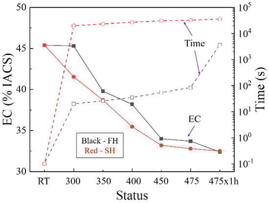 Figure 6. The EC evolution and the heating time corresponding to the temperature during the heat-up and solution treatment.